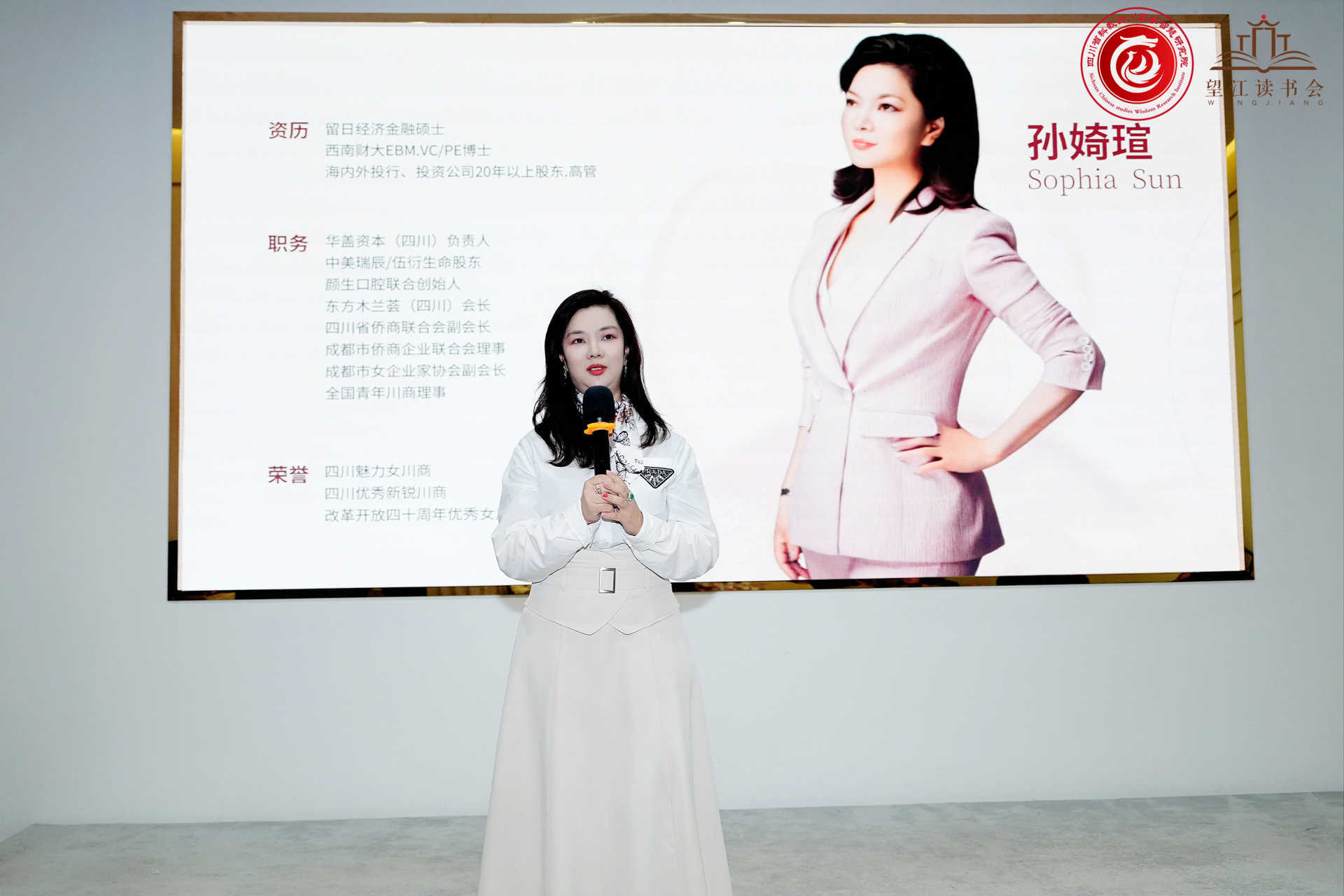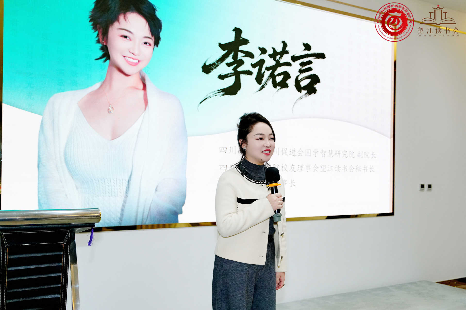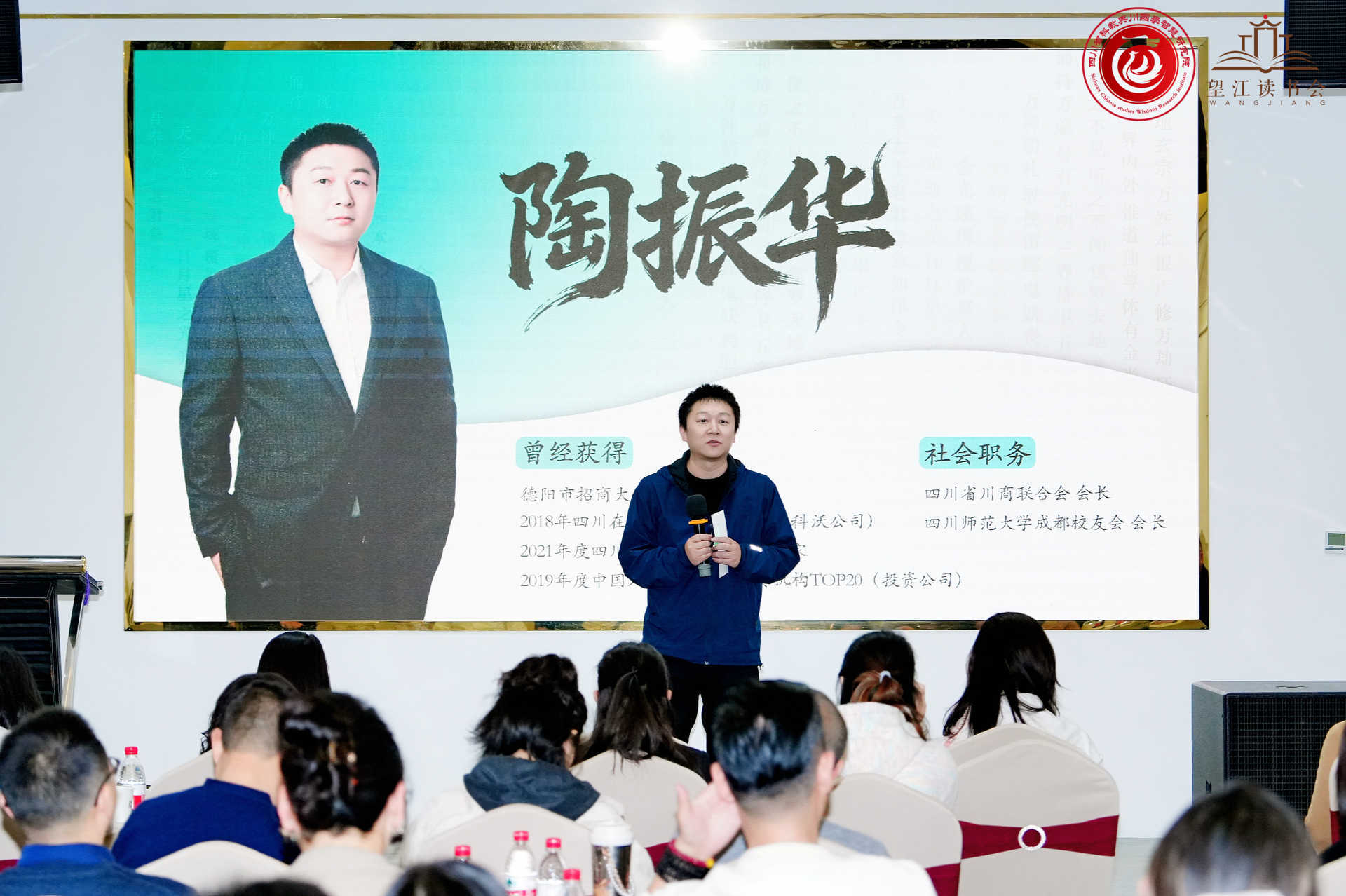 讲座正式开始前,望江读书会秘书长,成都绮客文化董事长李诺言女士进行了热情洋溢的欢迎致辞,她介绍了望江读书会的发起缘由和使命理念,希望大家能够通过阅读好书增强自己的个人魅力修养。在李诺言的邀请下,四川省川商联合会会长,四川师范大学成都校友会会长陶振华先生、东方木兰荟四川会长、成都市女企业家协会副会长孙婍瑄女士也登台致辞,对读书会活动的举办予以支持和厚望。