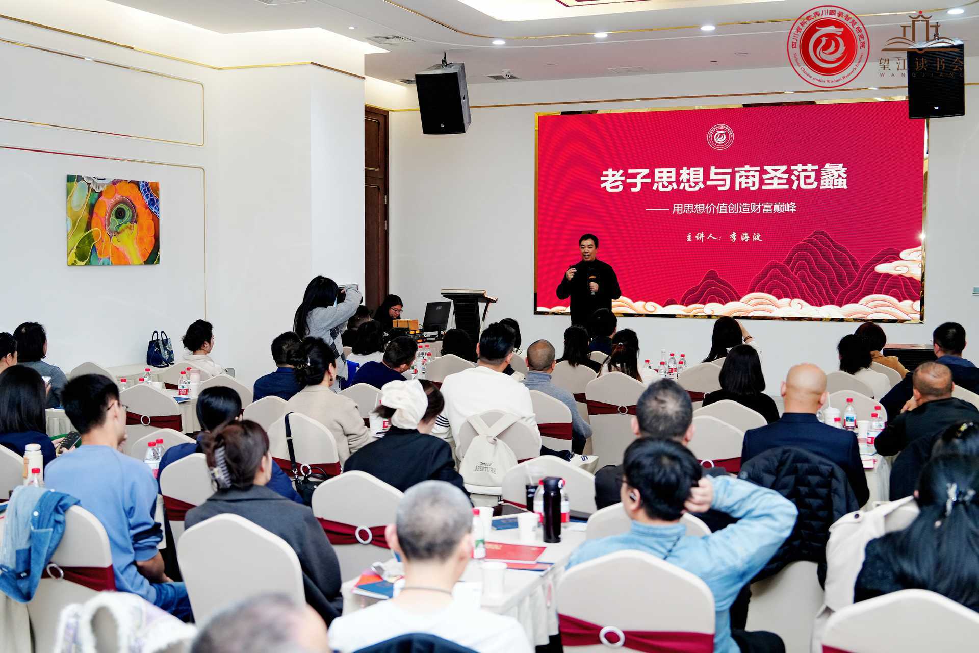 3月12日,由四川省科教兴川促进会国学智慧研究院、四川大学商学院校友理事会望江读书会主办,四川省川商联合会、东方木兰荟四川分会、中美瑞辰口腔医院和海丝福茶文化空间联合协办的《老子思想与商圣范蠡》国学公益讲座,在枫丹国际商场三楼举行。本次讲座由四川省科教兴川促进会国学智慧研究院院长,知名黄老道学研究专家,《中国道商》学科知识体系创建人李海波先生进行讲授分享,六十余位国学文化爱好者进行了现场聆听。